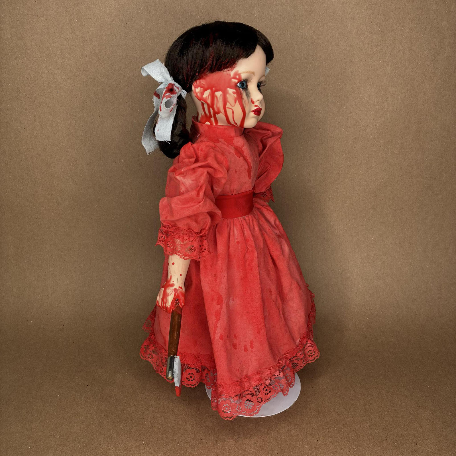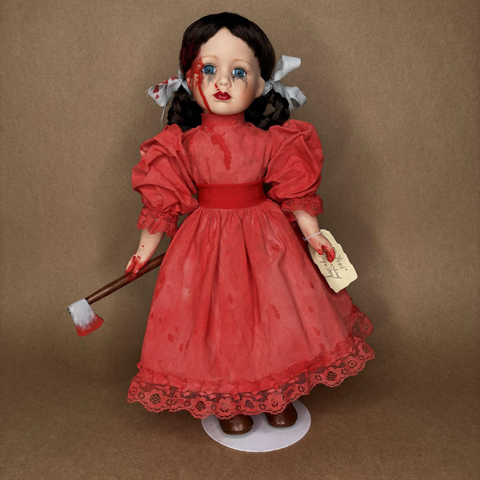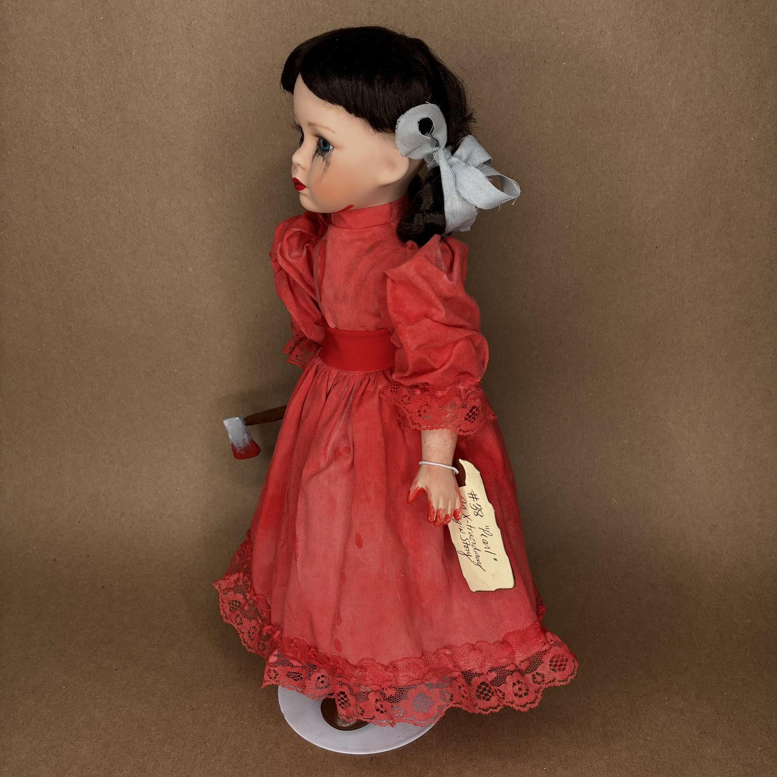 Meet Pearl, a handmade creation that captures the unsettling charm of the film's dark spirit. She features blood-splattered details and a handcrafted axe, eerie touches that bring out her sinister way of life.