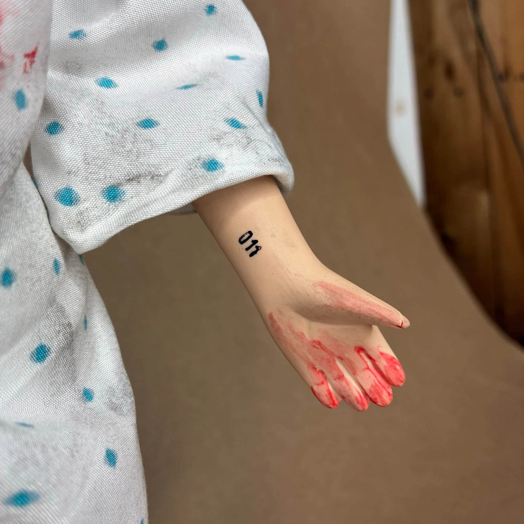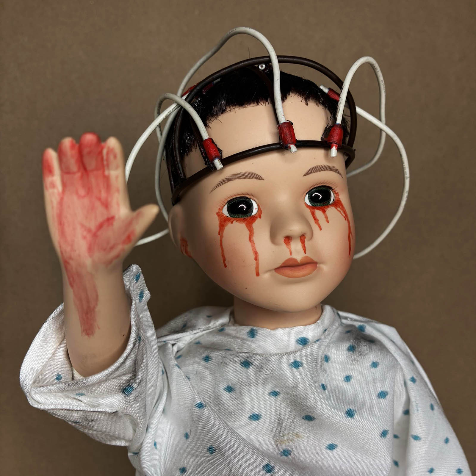 Inspired by Eleven from Stranger Things, this #41 handmade horror art doll stands 17" tall and is crafted using recycled materials. Her dress and headpiece are fully handmade, and she features the iconic "011" tattoo on her wrist. Each doll is uniquely created, tagged, numbered and signed by Erika's Emporium. Original one-of-a-kind collectible for fans of creepy art and cult classics.