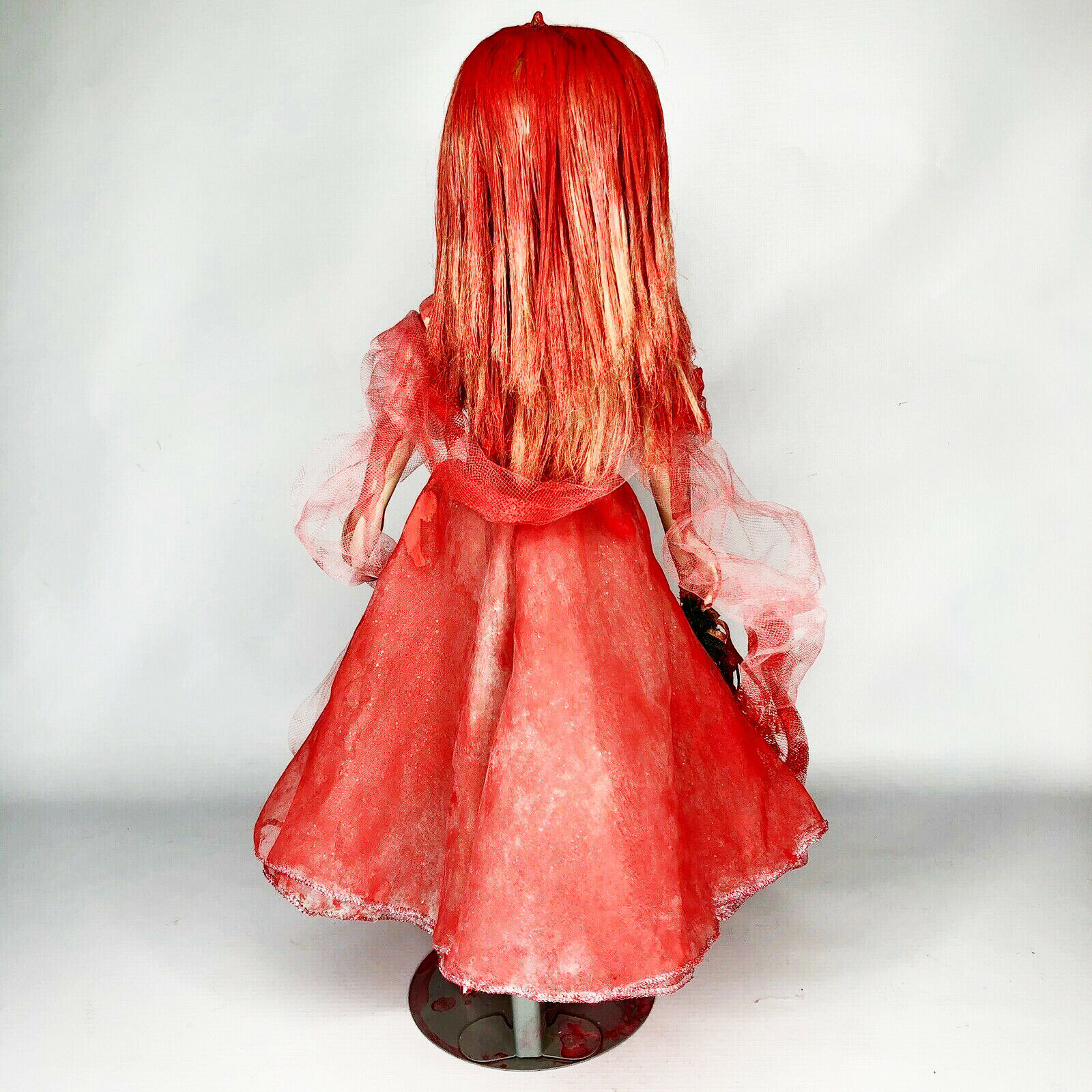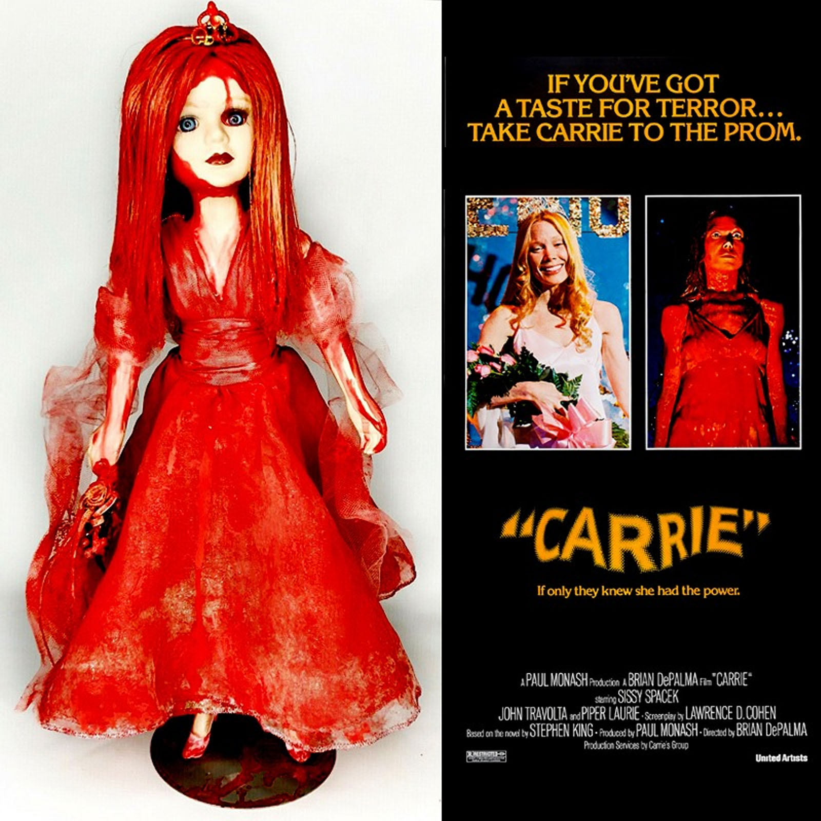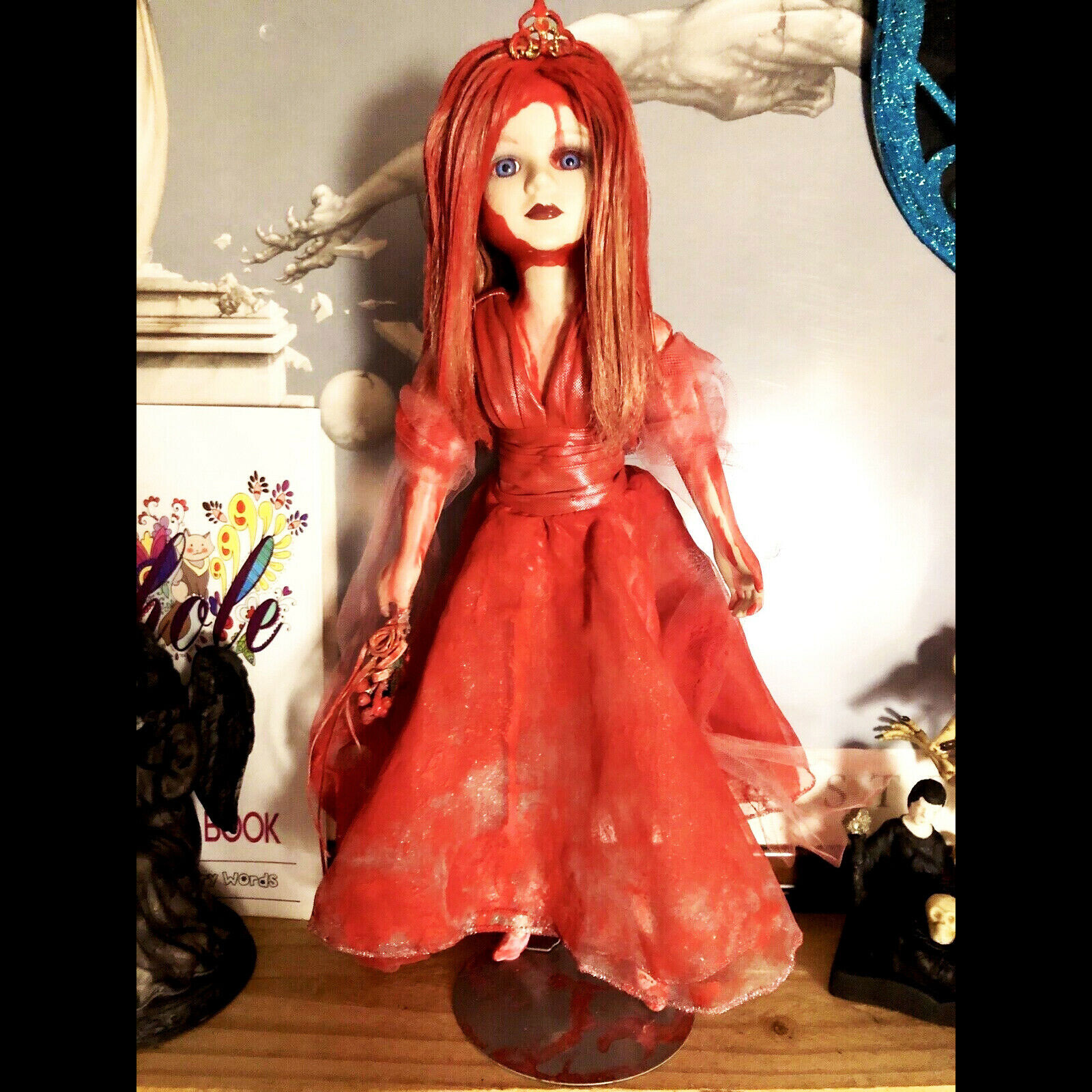 Inspired by Carrie White in the chilling adaptation of Stephen King's horror novel "Carrie". Custom 17" Numbered and Signed Doll Horror Scary Gothic decor. (Doll with stand). They're All Gonna Laugh at You. Supernatural powers. Prom night gone wrong. Dark and violent. This Carrie Doll is intended for collection and display only. Not intended for children. Clothes cannot be removed and only light dusting of doll is recommended. This doll is handmade with recycled items and they may contain imperfections. Tagged, numbered, signed with date of rebirth.